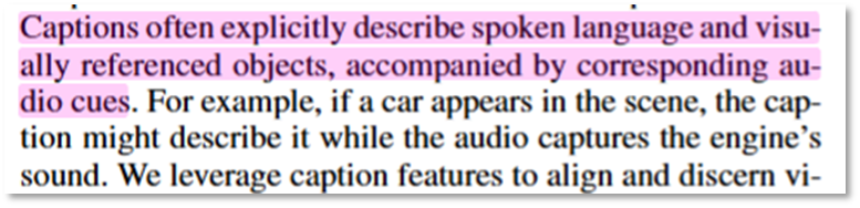 다음으로 임베딩된 모달리티별 특징량들은 self-attention module로 표현력이 증강됩니다. 이후 caption 도메인의 데이터는 비전과 오디오 도메인을 위해 보조적으로 사용되는데, 이는 우측과 같이 캡션이 주로 영상에 나오는 객체나 컨텍스트를 직접적으로 설명하는 역할을 하기 때문이라고 설명합니다. 이러한 설명을 통해 해당 연구의 경우 비전 도메인을 메인으로 인게이징 클립 생성을 수행하고자 함을 예측할 수 있습니다.