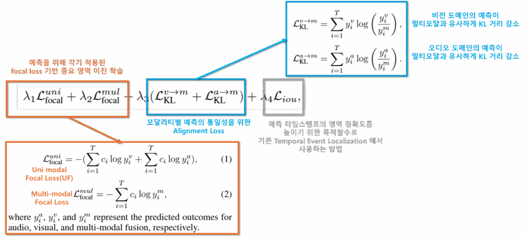 멀티 모달리티 모델의 학습의 경우 모달리티간 정보 불균형으로 인해 자칫하면 학습이 실패하는 등 안전성이 좋지 않습니다. 논문에서는 이를 해결하기 위해 비전과 오디오 모달리티, 그리고 멀티모달리티에 대해 각각 예측을 위한 MLP 구조를 도입하고 타임스템프 예측을 수행하도록 설계했다고 합니다. 또한 최종적으로 예측된 타임스템프의 확률 분포를 일치시키기 위한 Alignment Loss를 도입했다고 합니다. 모델에 사용된 Loss는 아래와 같습니다.