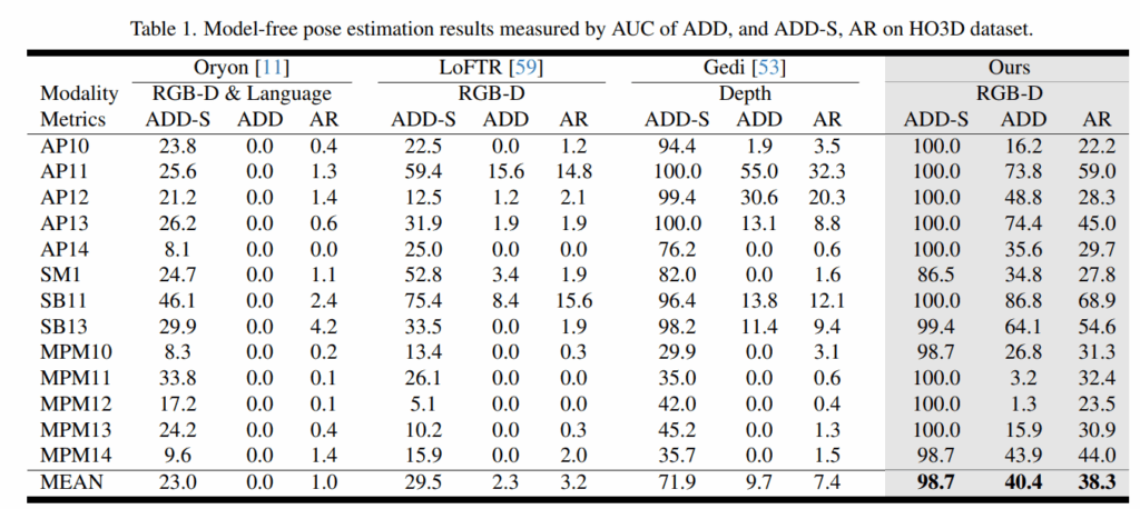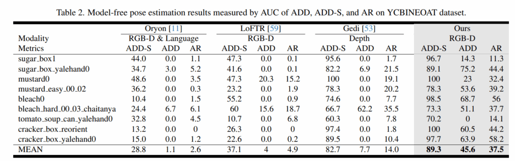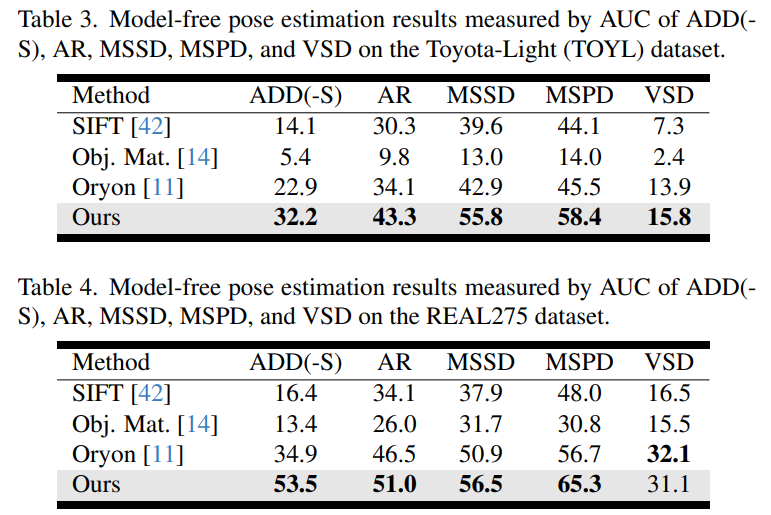 저자들은 Model-free 방법들과 REAL275, Toyota-Light, HO3D, YCBInEOAT, LM-O 5개의 공개 데이터셋에서 평가를 진행했습니다. 모두 시점차이, 조명변화, occlusion을 포함하는 데이터셋이라고 합니다. HO3D의 경우 사람 손과 물체가 상호작용하는 데이터셋이고, DexYCB 데이터셋에서 같은 물체가 있는 데이터를 샘플링 해서 활용했다고 합니다. YCBInEOTA는 dual arm robot manipulation 상황을 담은 데이터셋입니다. 세부적으로는 single arm pick and place, hand manipulation등도 포함되어 있다고 하네요. 저자들은 해당 데이터셋 내의 다양한 이미지로부터 대응하는 이미지들을 DexYCB에서 매칭해서 실험을 진행했다고 합니다. Toyota-Light의 경우 조명 변화가 심한 데이터셋, REAL275은 다양한 viewpoint에서 제한된 시야와 occlusion 상태가 포함된 데이터셋이라고 합니다. LM-O는 clutter한 환경에서 textureless한 물체들로 구성되어있다고 합니다. Metric의 경우 ADD, ADD-S와 AR(BOP challenge의 평가지표)를 사용했습니다.