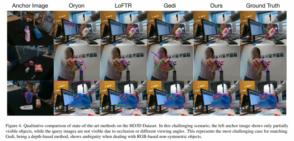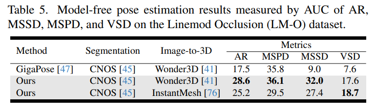 마지막으로 LM-O에서는 GigaPose와 비교했는데, 공정성을 위해 Segmentation과 Image to 3D 과정 (pose 추정 전단계)를 GigaPose의 방법을 그대로 사용해서도 비교했다고 합니다. 다양한 데이터셋에서 큰 성능차이를 보이며 저자들의 방법이 real world application에서의 믿을만한 방법임을 어필했습니다.