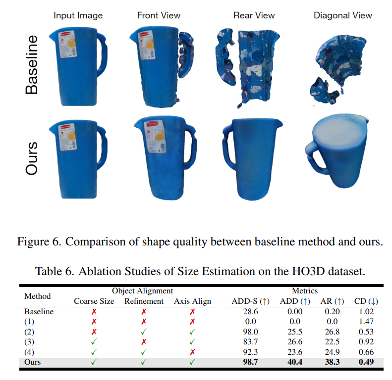 O_M’을 복원한 뒤에는 O_M′을 기반으로Object & Size Refinement 절차를 수행해서 앵커 이미지와 비교했을 때 metric scale의 size와 pose가 같은 3D 객체 O_M을 구합니다. 이 과정에 Foundation Pose를 활용합니다. 저자들은 FoundationPose에 크기 추정 작업을 pose refinement과정에 통합한 Joint Module을 추가해 pose를 추정하는 과정에 scale을 포함시켰습니다.
