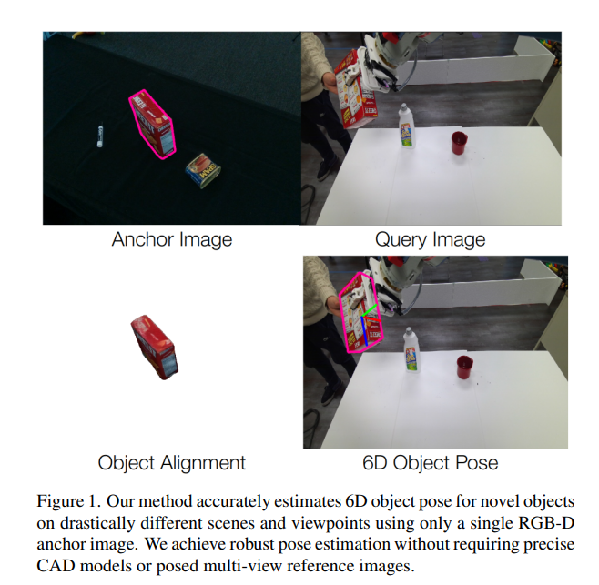 안녕하세요 이번주는 Scene Complete과정에 속하는 6D Pose Estimation 논문을 리뷰하도록 하겠습니다. 단 한장의 RGB-D 앵커 이미지만 활용해 unknown 객체의 6D pose와 metric scale을 추정하는 model-free 기법입니다.