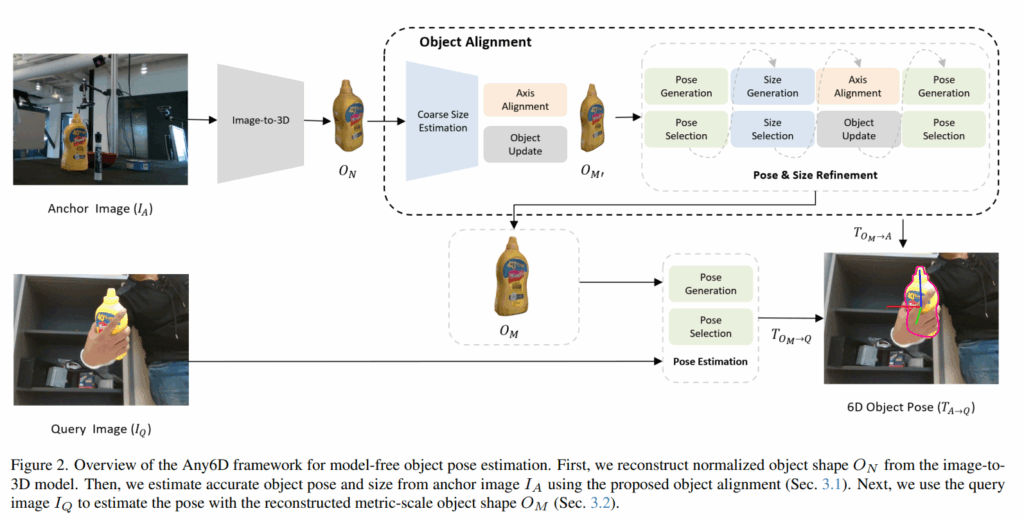 우선 RGB-D 단일 뷰에서 객체를metric scale로 복원할 수 있는 방법은 존재하지 않습니다. 따라서 저자들은 최근 발전한 RGB 기반의 image to 3D 방법들 중 다양한 객체에서 우수한 성능을 보인 InstantMesh를 바탕으로 객체를 metric scale로 복원했다고 합니다. InstantMesh로 복원한 3D 객체 형상은 [-1, 1] 범위의 정규화된 스케일을 갖는 형태를 출력합니다. 따라서 실제 장면 내의 scale이나 위치가 반영되지 않아 pose 정합에 직접적으로 사용할 수 없습니다 (크기가 다르기 때문입니다). 이를 해결하기 위해 저자들은 먼저 객체의 크기를 대략적으로 추정한 뒤 앵커 이미지 (I_A)와 정규화된 3D Mesh (O_N) 간의 3D, 2D 정렬을 수행합니다.
