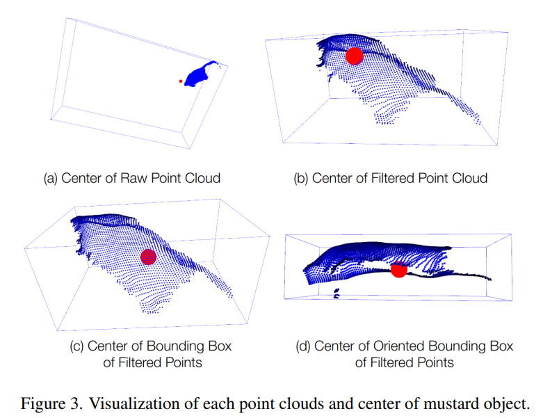 먼저, I_A와 O_N 각각의 객체 중심을 기준으로 pointcloud를 비교해 대략적인 크기를 설정합니다. 이때 중심을 단순히 포인트들의 평균을 이용해 설정했을 때는 partial viewpoint와 앵커 이미지의 outlier 때문에 신뢰성이 떨어집니다. 위의 Figure 3를 보시면서 이해하시면 편할 것 같습니다. Figure 2의 머스타드 병을 기준으로 생각하시면 됩니다. Axis-aligned bounding box를 사용하는 방법 또한 가시적인 범위가 적을 경우 부정확한 결과를 얻을 수 있다고 합니다. 이를 해결하기 위해, 저자들은 oriented bounding box를 이용하여 앵커 이미지의 객체 중심을 계산합니다(Fig.3 – (d)). 이렇게 얻은 중심을 위해 이 bounding box를 XYZ 축과 맞춥니다. 이후 다양한 회전 각도를 샘플링하고, 각 회전 상태에서 IA와 ON의 bounding box 간 IoU를 계산합니다. IoU가 가장 높은 회전·스케일 조합을 선택하여 O_N을 변환함으로써 O_M′(Coarse Alignment된 객체)을 얻고, 이를 기반으로 이후의 정확한 scale과 pose를 추정합니다.