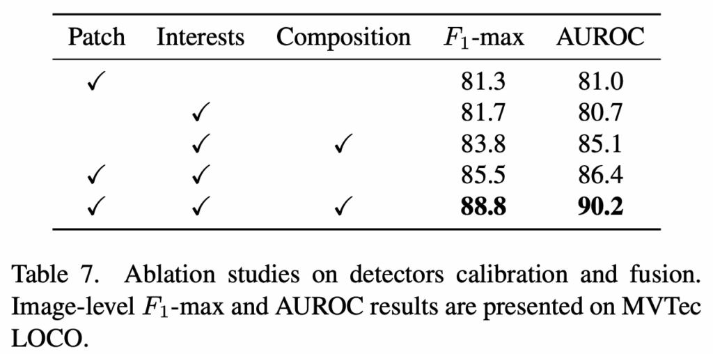 그 다음 table7에서는 각 개별 detectors들의 F1max 성능과 auroc 성능, 그리고 이들을 fusion한 성능을 함께 보여주고 있습니다. 세 patch, interest, composition을 한번에 fusion하여 사용한 경우가 가장 좋은 성능을 보이는 것을 보아 여기서도 table6과 마찬가지로 서로 다른 detector들이 structural anomaly와 logical anomaly를 상호 보완적으로 처리할 수 있다는 점을 보여주죠. 이로써, 제안된 multi-granularity detector에서 제안된 score calibration과 fusion 부분의 효과가 있음을 확인할 수 있습니다.