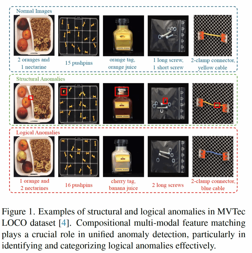 Intro에서 짧게 언급했듯이 structual anomaly들은 보통 어디가 긁혀있다거나 찌그러져 있는 것처럼 눈에 보이는 결함에 해당합니다. 반면에 logical한 anomaly는 단순 anomaly가 아니라 compositionality(구성 규칙)이 깨진 경우를 말하는데요. 즉, 겉보기에는 멀쩡하지만 뭔가 있어야 할 것이 없거나, 잘못되게 놓여있는 경우를 말합니다.