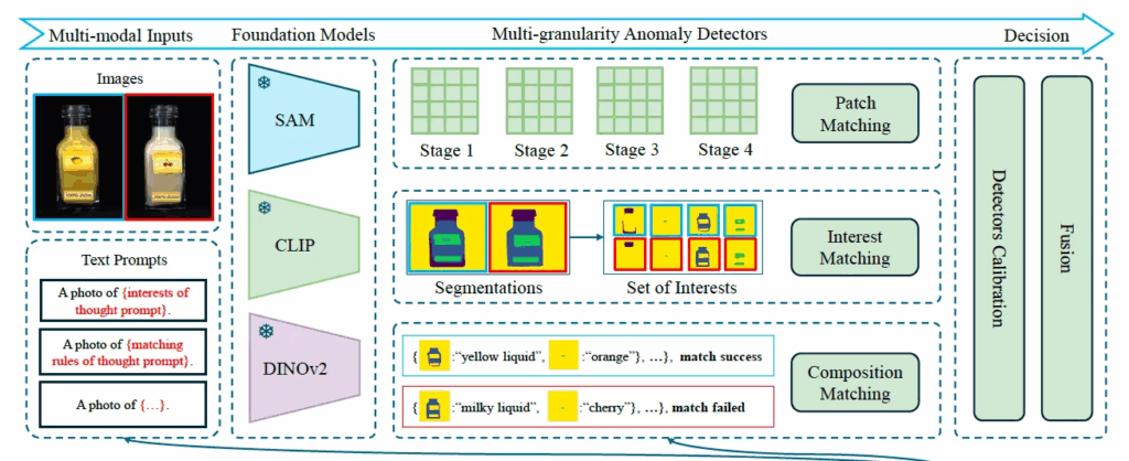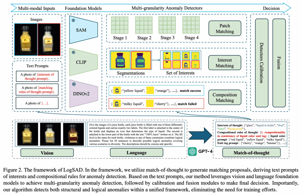 위 Fig2에서 LogSAD의 전체적인 프레임워크를 살펴볼 수 있습니다. 크게 두 부분으로 나눠볼 수 있는데, 아래쪽에 그려져 있는 gpt-4를 사용하는 match-of-thouht(MoT) 부분과 그 위에 SAM, CLIP, DINOv2를 사용하는 multi-granularity detectors 부분입니다.