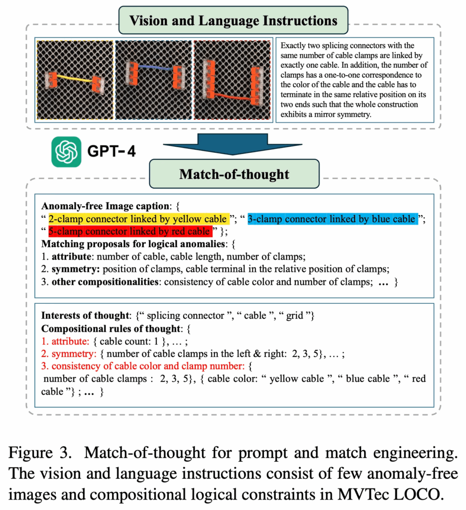 구체적으로는, 저 Fig3에 있는 입력 image의 경우에는 MVTec LOCO라고 하는 데이터셋인데요. 이 데이터셋에는 class마다 특정한 논리 규칙이 포함이 되어 있습니다. 이 논리 규칙 설명을 기반으로 instruction으로 만들어서, 몇 개의 normal image와 함께 GPT 입력으로 넣은 것이죠. 그렇게 되면, GPT4 바로 아래 부분을 보시면 되는데, GPT-4V가 이 normal image에 대한 caption과 함께 matching proposals들을 뱉어내게 됩니다. 즉, 어떤 것이 정상이고, 어떤 조합이 이상인건지 gpt가 output으로 내는 것이죠. 이렇게 output으로 나온 것을 정리하여 어떤 요소를 봐야 하는지에 대한 interest를 만들고(그림에서는 “splicing connector, cable, grid가 해당), 그 사이의 조합 규칙도 구성을 합니다.