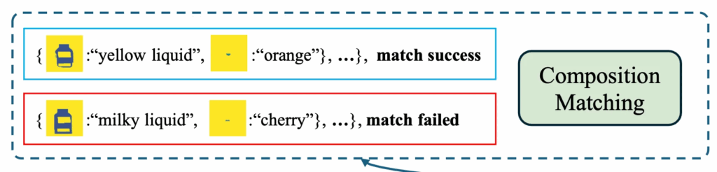 MoT에서 보시면 logical한 제약 조건들을 compositional rules로 표현하고 있습니다. 예를 들어 위 그림에 있는 것처럼 정상 상태에서는 액체 색깔과 label이 일치해야 한다는 규칙이 있다고 한다면, 이를 matching rule로 세팅을 해두고, CLIP을 통해 visual feature V(실제 액체 색깔)과, text feature T(라벨에 적힌 과일 이름)을 뽑아 냅니다. 이렇게 뽑힌 visual, text feature들은 이후, 조합 규칙이 잘 지켜졌는지(즉, 논리적인 이상이 없는지) 판단하는데 사용됩니다.