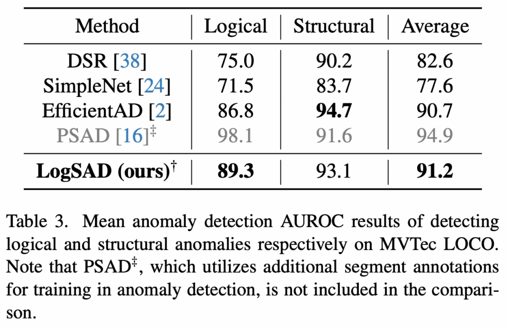 또, table3에서도 logical, structural을 구분하여 성능 평가를 했을 떄 기존 SimpleNet, EfficientAD보다 더 좋은 성능을 보이고 있으며 추가로 저기 회색 처리된 PSAD라고 하는 방법론은 다른 방법론들과는 다르게 추가적으로 segment annotation을 사용하는 학습 기법인것을 감안해서 보면 되겠습니다.