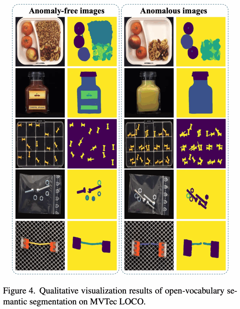 먼저 Fig4는 정성적인 결과인데, 이는 LogSAD 프레임워크에서 interest를 어떻게 정의하는지가 성능폭이 있을 것을 고려하여 이 interest 요소들을 이분매칭에 사용할 수 있도록 하기 위한 중간 segmentation 결과를 보여주고 있습니다. 그림을 보면 MoT와 VLM을 사용하여 수행한 sigmentation 결과는 엄청 정밀한 것을 확인할 수 있습니다. 이는 추가적인 학습 없이도 효과적으로 semantic segmentation이 가능하다는 점을 시사하고 있습니다.
