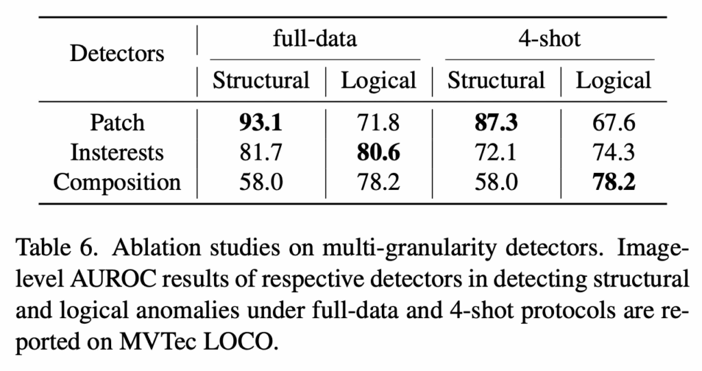 또 다음으로 table6을 보면 제안된 multi-granularity anomaly detectors에 관한 실험인데요. 각 detectors가 structural anomaly와 logical anomaly를 다루는 방식에서 일관적으로 어떤 요소가 둘 다 성능이 항상 좋지 않은 점을 볼 수 있습니다. 예를 들어 patch의 경우에는 structural에서 성능이 높지만, logical 성능은 좀 떨어지는 편이구요. composition의 경우에는 structural 성능은 좀 떨어지지만 logical은 성능이 높인 편입니다. interests는 이 둘을 보다 균형적으로 다루는 느낌이구요. 이를 보아 이 셋이 서로 상호보완적인 특징을 갖는다고 볼 수 있습니다.