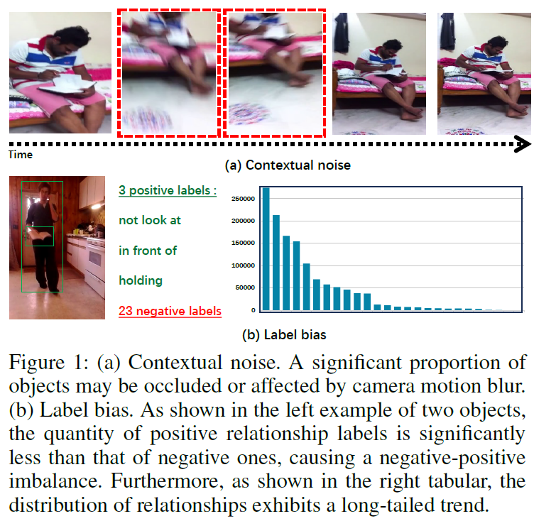 첫 번째 문제는 contextual noise입니다. 비디오 데이터는 연속된 프레임들로 구성되는데, 이들 중 일부 물체들은 occlusion이 일어나거나 motion blur가 발생하기 때문에 맥락/물체 정보를 추출할 때 노이즈나 잘못된 정보가 포함되어 모델 예측의 정확도를 떨어뜨릴 수 있습니다.