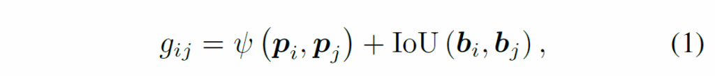 우선 기존 연구에서 제안된 방식을 참고해서 물체의 외형(appearance)와 공간적 위치를 기반으로 한 score function을 정의하고, 이를 통해 프레임 간 시간적 일관성(temporal consistency)를 확보합니다. 이 때 서로 다른 프레임에 존재하는 물체 i와 j의 matching score를 다음과 같이 정의합니다.