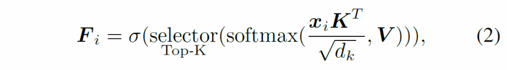 하지만 비디오의 길이가 길어져 프레임 수가 늘어나면 target object와 연관된 object의 수도 함께 증가하기에, 관련성이 낮은 객체로 발생하는 신뢰도가 낮은 spatio-temporal 정보를 제거할 필요가 있습니다. 저자들은 이를 위해 target object에 대해 가장 관련성이 높은 주변 object의 맥락 정보만 선택하는 differentiable Top-K selector를 제안합니다. 이 selector는 다음과 같이 정의됩니다 :