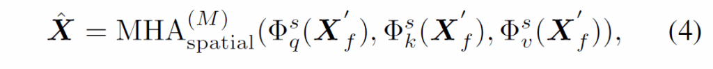 식 (3)에서 Φ는 각각 단순한 linear transformation입니다. 추가적으로, 객체 간 공간적 상호작용 정보를 처리하기 위해 또다시 M개의 MHA 레이어를 통과시킵니다.