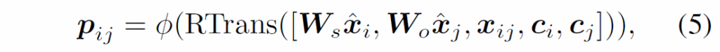 여기서 RTrans는 위에서 제안한 spatial-temporal message passing 모듈과 동일한 구조를 사용하여(MHA 두번) relation feature를 정제하는 과정이고, ϕ는 classification 연산입니다. {c}_{i}, {c}_{j}는 각각 물체 i,j의 semantic embedding이고, {W}_{s}, {W}_{o}는 fusion을 위한 projection 행렬이고, [ , , ]는 벡터 간 concat연산입니다.