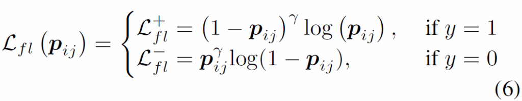 focal loss 수식 (6)에서 y는 GT label입니다. γ는 focusing parameter로, γ>0 일 때 easy negative sample이 손실함수에 미치는 영향을 줄이도록 설계되었습니다.
