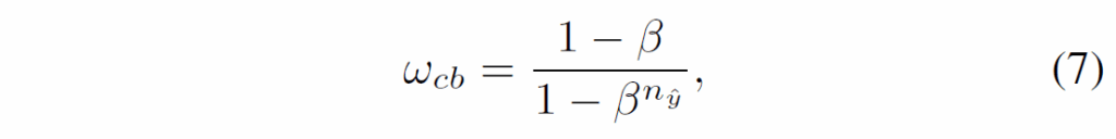 여기서 {n}_{\hat{y}}는 학습 데이터에서 GT class \hat{y}의 샘플 개수를 의미합니다. tail class에 대해 {w}_{cb}값이 커질수록 해당 샘플의 가중치가 증가하여 모델이 positive tail class에 더 집중할 수 있도록 유도하게 됩니다(반대로 head class에는 가중치가 작아집니다). β∈[0, 1)는 하이퍼파라미터로, {n}_{\hat{y}}가 증가할 때 가중치 증가율을 조정하게 됩니다.