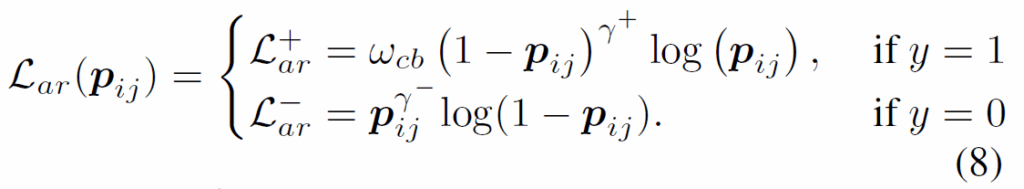 이제 aymmetric focusing factor {γ}^{+}, {γ}^{-}와 적절하게 {w}_{cb}를 적용시켜서 최종적으로 다음과 같이 AR-Loss를 정의하게 됩니다 :