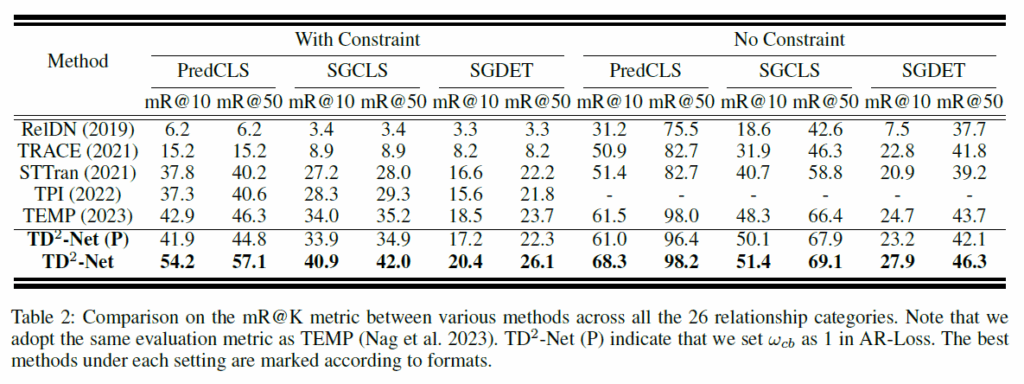 저자들은 비디오 SGG에 발생하는 이러한 문제점들(noise 및 bias)을 완화하기 위해 TD2-Net이라는 방법론을 제안하게 됩니다.