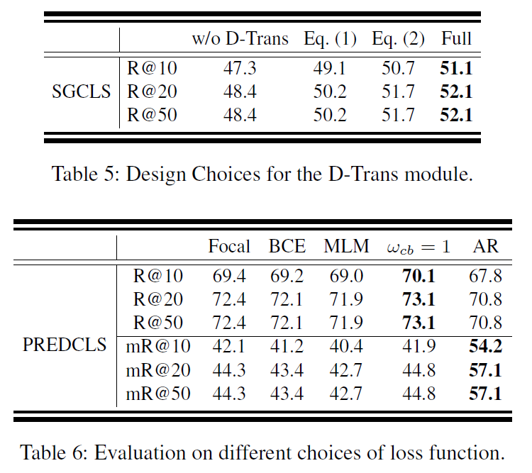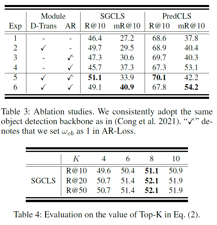 Table 1,2에서 확인하실 수 있듯, AR-loss를 적용했을 때 mR@K는 기존 방법론들보다 상당히 높지만, R@K 성능은 기존 방법론들보다 많이 떨어집니다. 학습 과정에서 tail class에 집중하고 head class를 suppression했기에 오히려 head class 예측 능력이 떨어져 R@K의 성능이 크게 떨어진 것으로 보입니다.
