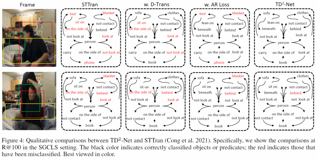 마지막으로 정성적 결과 보고 리뷰 마무리하겠습니다. Fig.4에는 STTran, D-Trans 적용 모델, AR-Loss 적용 모델, TE2-Net의 SGCLS 예측 결과를 비교한 것입니다. D-Trans의 경우 sofa, book, clothes와 같이 식별이 어려운 객체의 예측을 향상시키고, AR-Loss의 경우 relation 예측을 더 정교하게 할 수 있게 됬으며, 모두를 조합한 TD2-Net이 object와 relation 모두에서 종합적으로 우수한 결과를 냈다고 합니다.