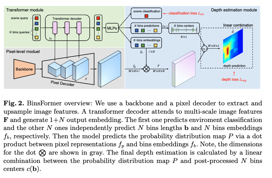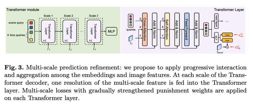 큰 흐름은 입력 RGB 이미지가 들어오면, 픽셀 레벨 모듈이 먼저 이미지를 쭉 훑어서 멀티스케일 특징 F와 f_p 를 뽑습니다. 그리고 멀티스케일 피쳐맵은 Transformer의 키, 밸류로 들어가. 여러 개의 쿼리 토큰이 어텐션으로 멀티스케일 특징 F의 정보를 흡수합니다. 그리고 나온 각 쿼리는 작은 MLP 헤드를 거쳐 두 가지를 뽑습니다. 하나는 bin의 길이 b(깊이 축을 나누는 폭), 다른 하나는 각 빈을 대표하는 bin 임베딩 f_b입니다. 즉, 빈을 클래스처럼 직접 예측하게 됩니다.