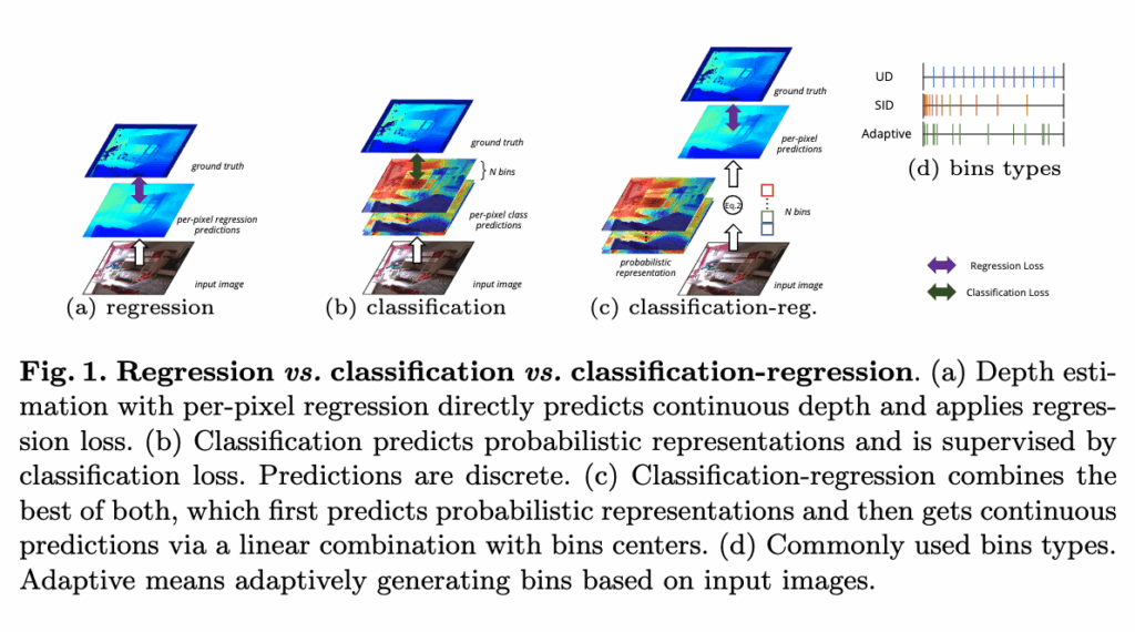 기존의 픽셀 단위로 depth를 regression하는 것(a)이 주류였는데, 이러한 방식은 깊이를 깔끔하게 예측할 수 있긴 하지만 학습과정에서 수렴이 느리고 성능 또한 아쉬운 경우가 있었다고 합니다. 반대로 연속 깊이를 여러 구간으로 이산화해서 그 구간을 픽셀별 classification하는 방식(픽셀별 분류 문제(b))으로의 접근은 성능은 오르지만, 경계가 들쭉날쭉하게 나타난다는 단점이 있었습니다. 그래서 Adabins라는 각 픽셀에 대해서 이 픽셀이 어느 bin에 속할지 확률적 표현을 학습하고 빈 중심(bin centers)과의 가중합으로 최종 깊이 값을 예측하는 즉, 분류-회귀 혼합 아이디어(c)가 등장했습니다. BinsFormer는 그 혼합 구조를 바탕으로 Adabins 처럼 bin이라는 구간을 adaptive하게 생성하는 방식을 사용하되 visual feature 생성과 bin 생성은 따로 진행을 하면서 트랜스포머를 도입하여 Bin과 visual feature 간의 상호작용을 통해 bin의 품질을 올리고자 하는 쪽에 초점을 둔 프레임워크라고 보시면 될 것 같습니다.