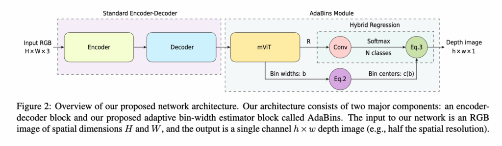 기존의 픽셀 단위 depth를 regression하는 것과는 다르게 bin 이라는 개념을 도입해서 depth를 어떠한 depth 범위의 구간으로 classification하는 연구가 진행되었습니다. BinsFormer는 마찬가지로 bin이라는 개념을 활용하고 그 구간을 adaptive하게 생성하고 이를 토대로 depth를 추정하는 방식의 방법론이라고 보시면 될 것 같습니다. 자세한 내용은 아래피규어를 바탕으로 설명드리도록 하겠습니다.