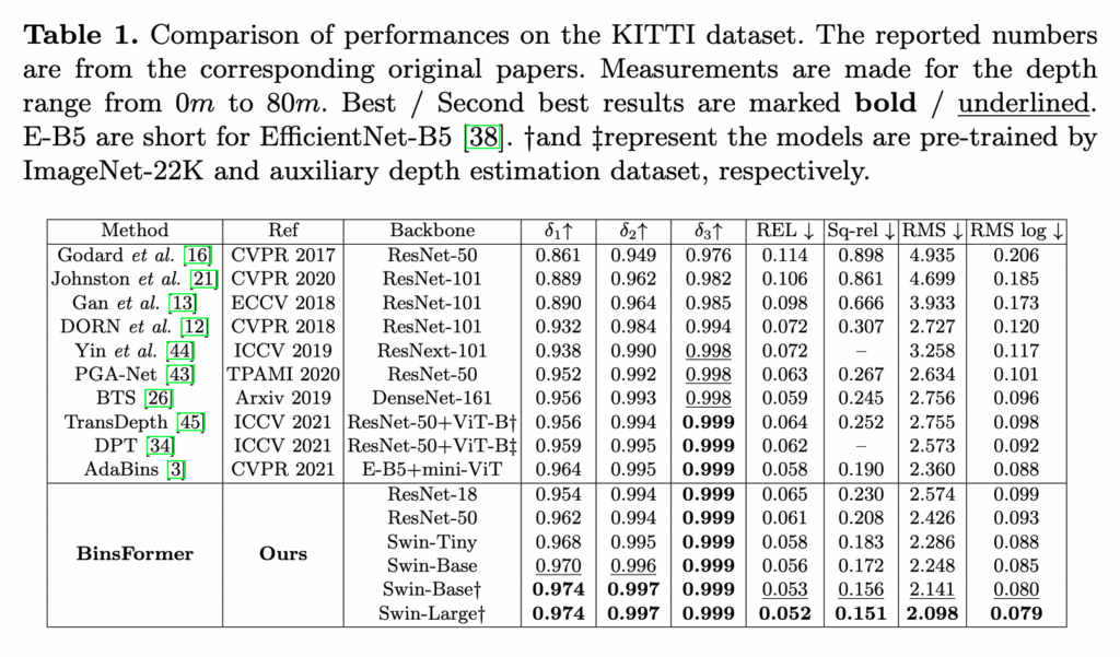 표 1은 KITTI(Eigen, 0–80m)에서의 비교테이블인데. 백본이 가벼워도 경쟁력 있다 라는 것을 확인 하실 수 있고 transformer 기반의 백본을 사용하면 SOTA성능을 보이는 것을 확인 하실 수 있습니다.