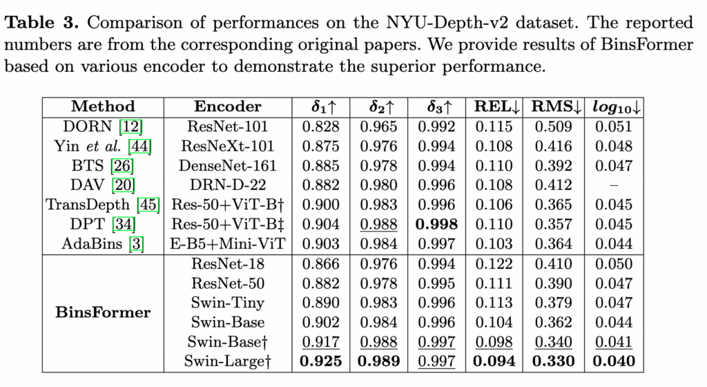 NYU-Depth v2(0–10m)에도 kitti랑 마찬가지로 백본이 강해질수록 BinsFormer가 꾸준히 올라가지만 엄청 낮지는 않지만 다소 낮은 성능을 보이는δ3의 성능에 대한 저자의 언급은 따로 없었습니다. 다만 Adabins와 비교했을 때에는 유의미한 성능 향상이 있다고 볼 수는 있을 것 같습니다.