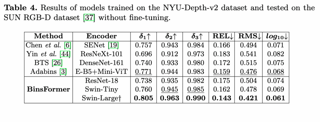 그리고 아까 첫 질문에서도 이야기했지만 Adabins의 Chamber loss가 불필요한 inductive bias를 학습시킨다고 했잖아요? 그러면 NYU로 학습하고 SUN RGB-D로 inference하는 표4의 zero-shot 평가에서 Adabins는 성능이 낮게 나와야하거든요. 불필요한 inductive bias를 만들어냈으니 학습 때 보지 못한 환경에서 추론할 때 잘못된 inductive bias로 인해 뎁스 성능이 떨어져야한다는 것이죠. 근데 결과적으로는 Swin-T의 binsformer보다 더 좋긴 하거든요 성능이. 그런 관점에서도 정말 Inductive bias가 잘못된게 맞나? 라는 생각도 들긴 해요.