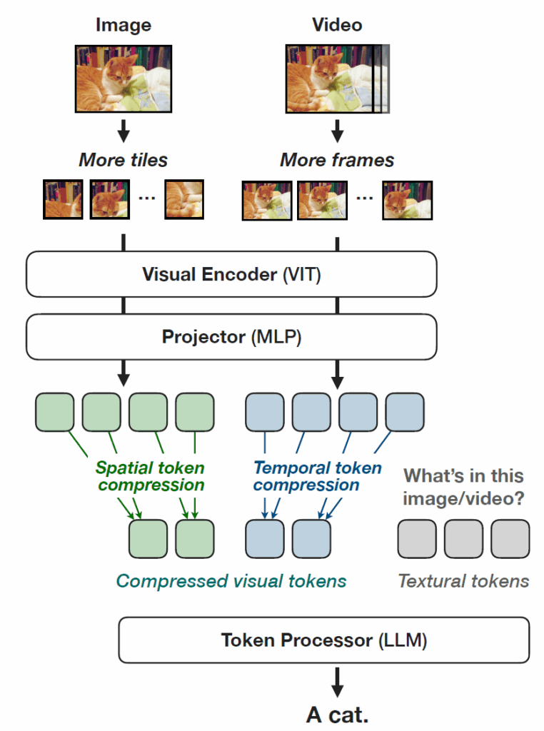 이러한 VLM 구조에서 이제 연산량을 많이 차지하는 부분을 찾아서 해결을 해야하겠죠? VLM의 연산을 가장 많이 잡아먹는 부분은 다 아시다시피 Visual token쪽입니다. 문장은 아무리 길어봤자 text token의 수가 그렇게 커질 수가 없지만 image의 경우 해상도가 높을수록 더 많은 visual token을 가지게 되고 이것이 video로 확장되는 순간 frame마다 visual token의 수가 늘어나는 것이기 때문에 더 많은 token이 발생하게 되는 것이죠.