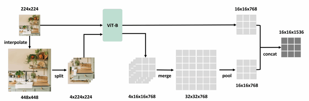 저기 그림에서는 만약 224×224로 사전학습된 ViT가 있다면 입력 영상을 224×224 뿐만 아니라 448×448로 키운다음 이를 다시 4개의 224×224로 1/4 조각씩 쪼개어 ViT에 태우는 것입니다. 이렇게 ViT 타고 나온 visual token들을 다시 이어붙여서 원래의 shape을 가지도록 만들어준 뒤 224×224의 입력 feature와 동일한 사이즈를 맞추기 위해 고해상도 visual token을 pooling해서 채널축으로 concat하는 방식이죠.