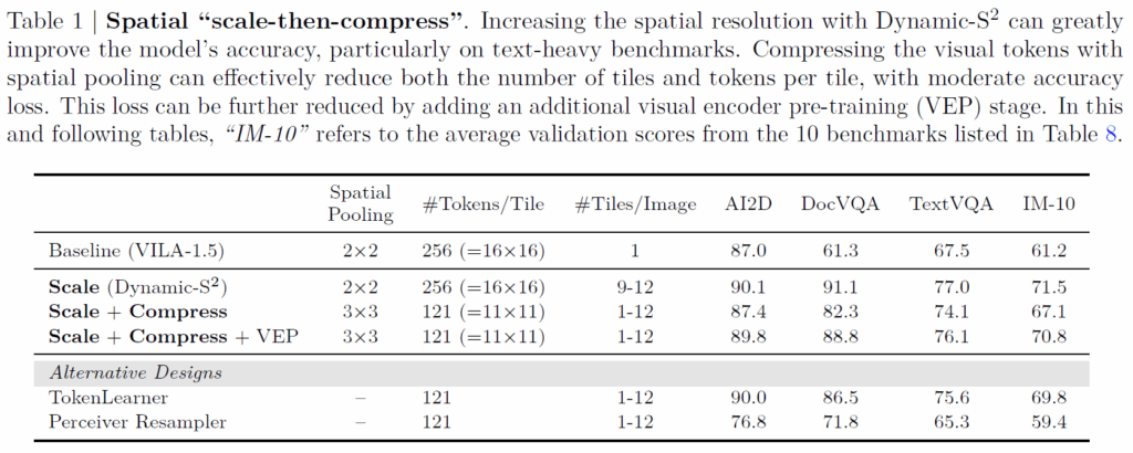 결과적으로 저자들의 scaling up과 compression 과정을 적용하게 되면 우선적으로 이미지의 고해상도 정보를 활용하다보니 text-heavy benchmark에서 30% 이상의 정확도 향상을 보았으며, 토큰의 수는 기존 baseline (이미지 한장 당 256개)보다 더 적은 수(121개)를 사용할 수 있었다고 하네요. (아래 표 참고)