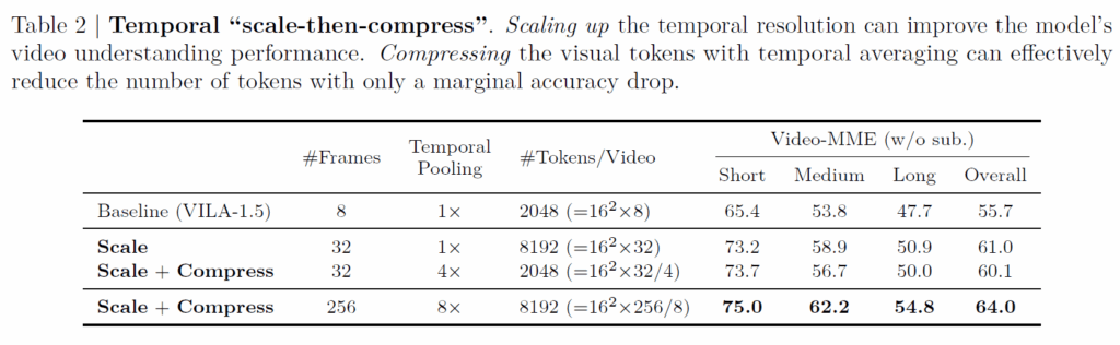 위에 표2는 temporal scaling and compressing에 대한 실험으로 기존 baseline이 8개의 frame을 사용하였다면 scale up하여 32개의 frame을 활용하였고 이때 정직하게도 기존 baseline의 2048개 visual token에서 딱 4배 증가한 8192개의 토큰 수를 가지게 됩니다.