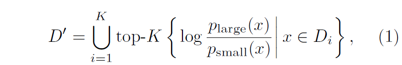 일단 수식은 위와 같은데 D_{i}, D' 는 각각 전체 데이터 셋 중 i번째 소스 데이터의 집합과 최종 압축된 데이터셋 집합을 의미합니다. 그리고 p_{large}, p_{small} 은 Large model과 Small model에서 추론한 정답 토큰의 확률 값을 의미합니다.