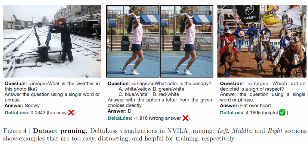 근데 퀄리티 좋은 데이터셋을 다양한 소스에서 모아야 scale-up이 가능한데 그게 사실 쉽지가 않습니다. 일단 기존에 Vision input, 또는 text only input에 대해서는 양질의 데이터를 선별하는 여러 연구들이 있긴 했는데, VLM에서는 이런걸 풀려는 연구가 거의 없다고 합니다. 근데 이제 자신들의 NVILA 모델은 1억개가 넘는 데이터로 학습을 하려다보니 학습 코스트가 너무 많이 들거든요. 결과적으로 1억개가 넘는 데이터셋을 다 활용하는 것이 아닌 압축하는 기법이 필요하다라는 필요성을 강하게 느낀 것 같습니다.
