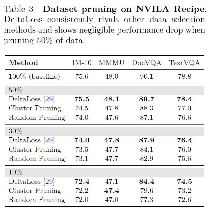 결론만 빠르게 말씀드리면 random pruning보다는 항상 delta loss방식의 pruning이 좋았다는 점이고, 또 50%정도의 pruning을 한 것이 데이터를 100% 전체 다 사용하는 것과 비교하였을 때 성능의 하락폭이 소수점1자리로 미미하거나 MMMU같은 경우에는 오히려 성능이 조금 더 오르는 등 정확도 측면에서 변화가 그리 크지 않더라 라는 점이구요. 대신에 학습에 사용되는 데이터는 절반이나 줄였기 때문에 아까 1억개의 데이터를 사용한다 했으면 5천만개를 일단 줄인 것이라 학습 시간을 2배 줄였다는 점에서 매우 유의미하다라는 점입니다.
