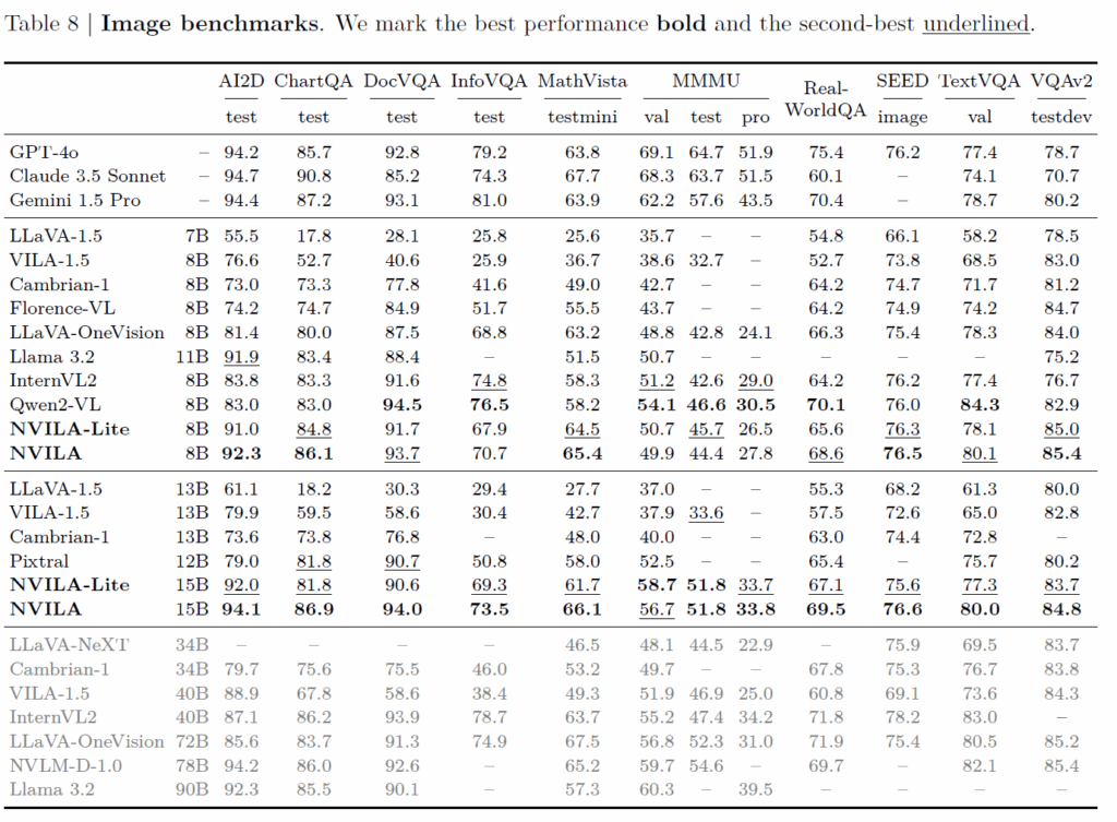 1. 이미지 벤치마크 성능 표 8에서, NVILA와 NVILA-Lite의 차이점은 무엇인가요? 학습-fine tuning-데이터셋 전반에 걸쳐 여러 contribution이 있는데, 각각이 NVILA와 NVILA-Lite에 어떻게 적용되어있는 것인지 설명해주시면 감사드리겠습니다.