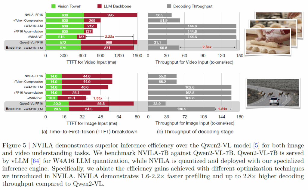 결론적으로 저자들이 제안하는 최종 모델이 Qwen2-Vl-FP16보다 TTFT가 1.55배 더 빠르다는 점, 그리고 Thoughput도 Qwen2보다 한 5배는 더 큰 것 같고 baseline보다도 1.24배 더 좋더라 라는 점입니다. 근데 이제 보시면 NVILA에 뭐가 많이 붙어있죠. 제가 방법론에서 소개드린 Token Compression 말고도 W4A16 LLM, W8A8 ViT 등등 뭐가 많이 붙어있는데 사실 저 부분이 제가 리뷰에서 미처 다루지 못한 기술적 키워드를 마구마구 넣은 개발쪽 내용들의 결과물입니다. 저자들이 method에서 소개를 하고 있는 contribution들 중 일부인데 너무 생소한 키워드 그리고 저쪽 분야에 대한 무지함으로 리뷰에 소개드리지 못한 점 양해부탁드립니다ㅜ.