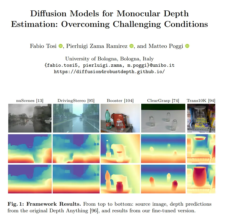 먼저 정상 상황의 클린한 이미지를 가지고 사전학습된 MDE 모델을 통해 초기 depth map을 출력합니다. 그 다음 동일한 이미지를 diffusion 모델에 넣어서 이상 상황이 추가된 이미지를 생성하는 것이죠. 이러한 이상 상황 이미지와 정상 이미지를 합쳐서 새로운 학습 데이터셋을 만들고, 처음에 초기 depth map을 예측하는데 사용하던 MDE 모델을 finetuning 하게 됩니다. Fig.1을 봤을 때, 두번째 행은 초기 depth map을 예측하는 Depth Anything 모델의 출력 결과이고 세번째 행이 finetuning을 했을 때의 결과 입니다. 발생하는 노이즈가 사라지고 물체를 더 명확하게 표현하고 있는데요, 이렇게 의도한대로 모델이 여러 이상 상황 속에서도 depth를 잘 추정할 수 있는 모델을 설계하는 것을 목표로 하고 있습니다.