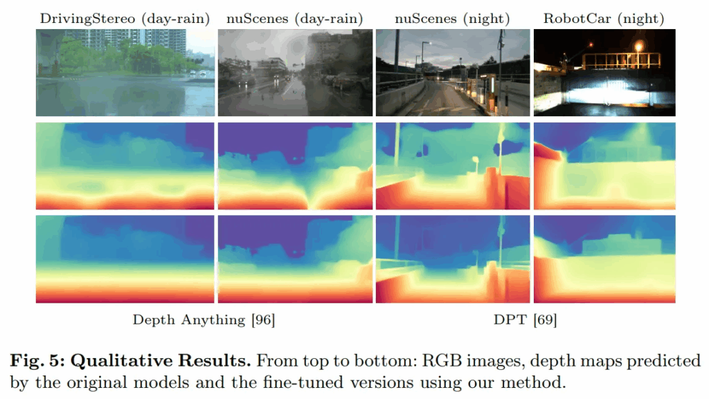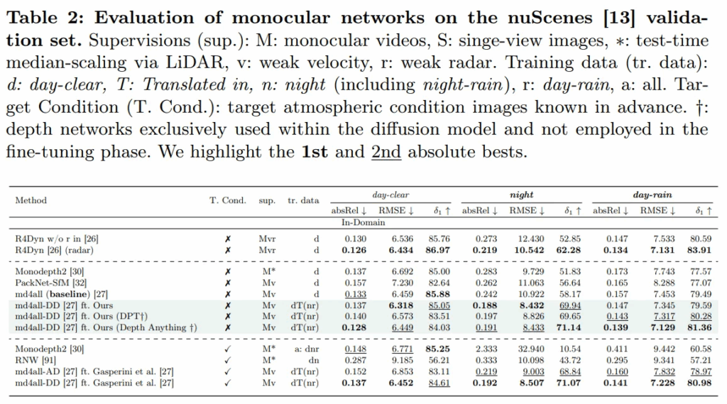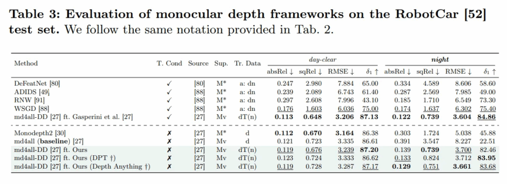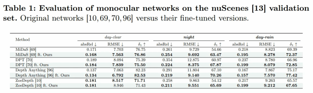 결과를 보면, 베이스라인 모델들은 그 자체로도 많은 데이터를 이용하여 일반화를 가지고 있는 모델들임에도 불구하고, 비 오는 낮이나 야간처럼 악천후 환경에서 성능이 크게 하락되고 맑은 낮처럼 일반적인 조건에서만 좋은 성능을 보이고 있습니다. 반면 그러한 베이스라인 모델들에 finetuning을 했을 때 모든 평가 메트릭과 날씨 조건에서 모두 베이스라인 성능 대비 향상되는 것을 알 수 있습니다. 이는 본 논문의 finetuning 방식이 어떤 모델인지와 상관없이 효과적이며, 기존의 MDE 모델들의 한계를 보완할 수 있었음을 보여줍니다.