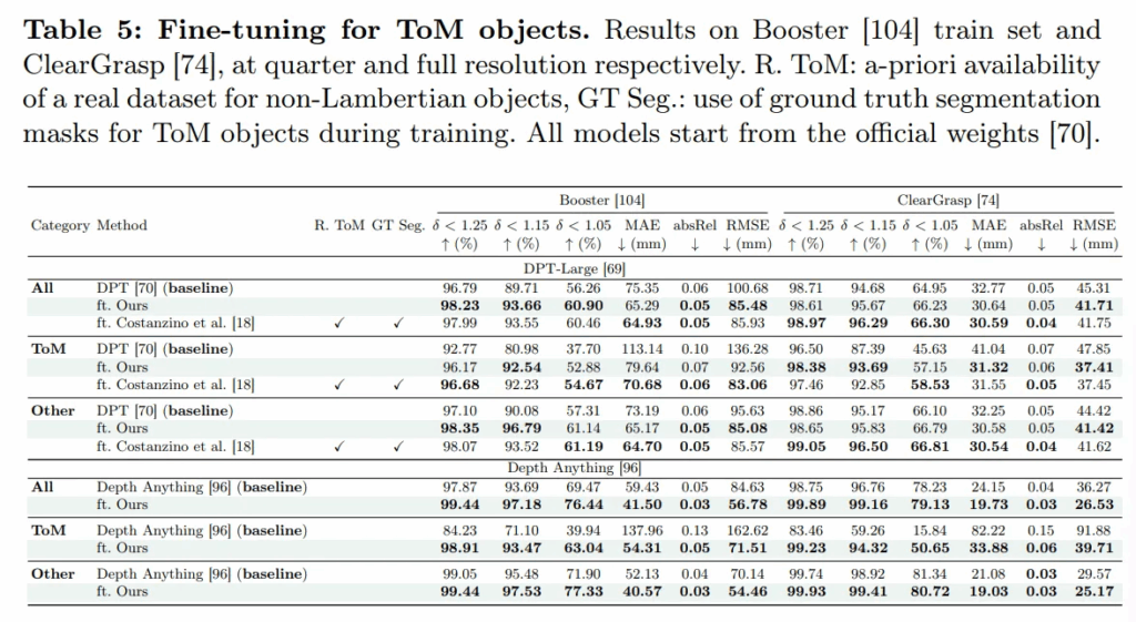 Tab.5는 여러 모델들을 이전 연구로 finetuning한 DPT, 그리고 본 논문의 방법으로 finetuning한 DPT를 같이 비교하고 있습니다. 이전 finetuing 연구는 실제 투명한 물체를 포함한 이미지와 그 물체의 정확한 segmentation 마스크를 이용해서 학습하게 되지만, 본 논문은 오로지 텍스트 프롬프트로 생성한 이미지에만 의존하게 됩니다.