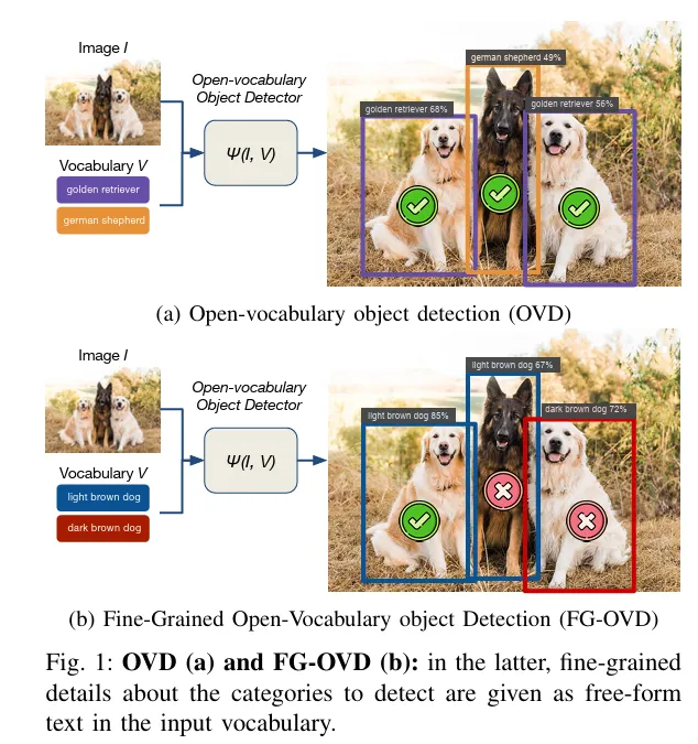 앞서 말했듯이 저자는 OVD 의 중요성을 먼저 언급하고, OVD가 가지는 문제점이 새 일반화 클래스에 대해서는 잘 탐지하지만, 미세 속성의 구분에는 약하다고 언급하며 그 예시로 light brown dog vs dark brown dog 구분이 흔하게 실패한다고 합니다.