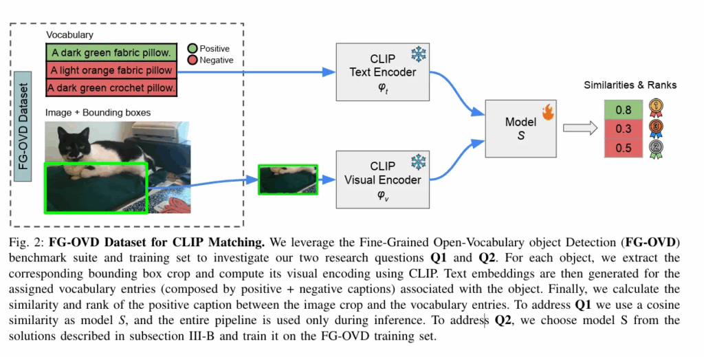 위의 Q1, Q2 를 해결하기위한 저자의 파이프라인입니다. 우선 1번문제를 다시 한번 다루자면, detector 의 문제인지 혹은 CLIP latent space가 문제인건지를 파악하기위해, GT정보를 crop해서 양과 음의 캡션에 각각 기존의 방식인 cosine similarity로 비교합니다. 이때 생각해야할 점은 정답인 “A dark green fabric pillow.” 가 오답인 “A light orange fabric pillow” 와 “A dark green crochet pillow.” 보다 높아야 합니다.