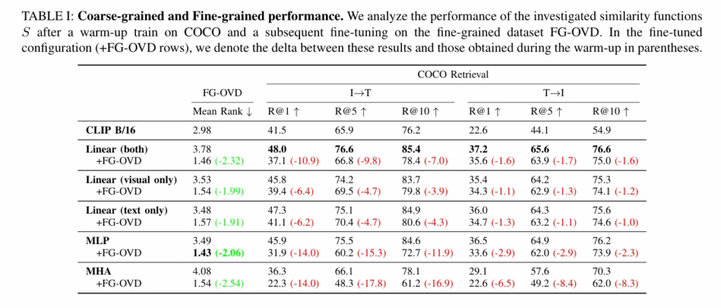 각각을 Coarse grained는 MS-COCO에서 평가하고 Fine grained는 FG-OVD 데이터셋에서 평가합니다. (원래는 detection용이지만 여기서는 크롭된 객체 이미지를 사용하여 분류로 변환했다고 합니다.)