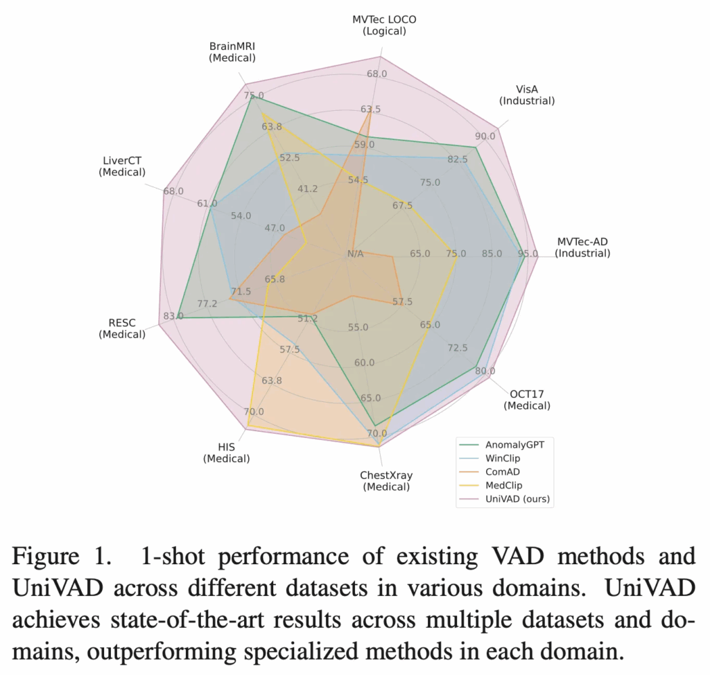 학습이 필요 없는 대신에 test할 때 그 query image로 들어온 object에 대한 normal sample 몇 개를 가지고 이상 탐지를 수행하게 되는데, 현존하는 few-shot 모델 중 1 shot 결과를 비교하고 있는 위 fig1에서 살펴볼 수 있듯이 핑크색 선인 본 논문의 UniVAD가 여러 도메인에서 가장 좋은, 안정적인 성능을 보이고 있습니다.