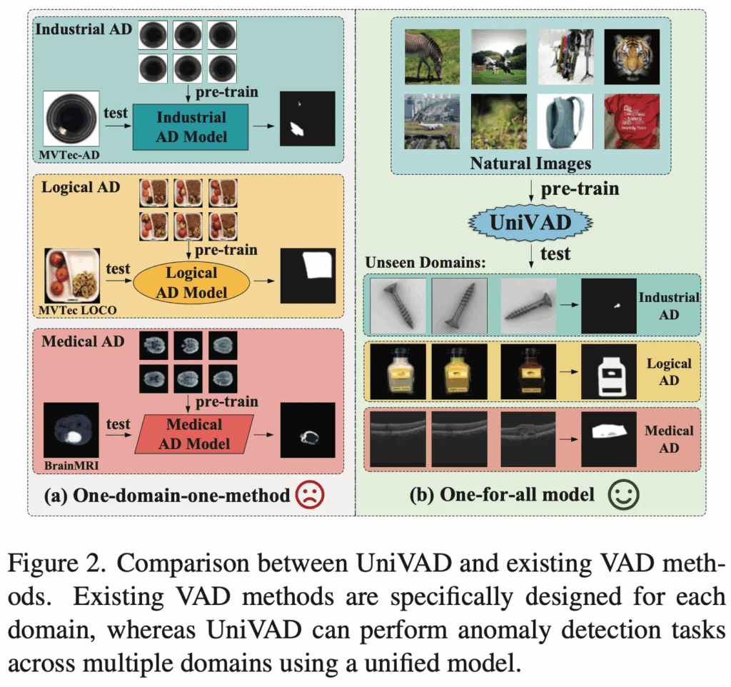 따라서 본 논문에서는 기존 AD 방법론들의 한계점을 해결하기 위해 UniVAD라고 하는 모델을 제안합니다. 이 UniVAD는 training-free 모델로, industrial, logical, medical 등등 다양한 도메인에서의 이상 탐지를 처리하도록 설계되었습니다.